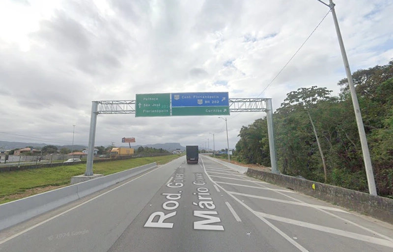 Cuando vayan por la BR-282, tienen que tomar el rulo de acceso a la autopista, dónde antes era la bajada a Palhoça por la Rodovía Ulysses Guimarães.